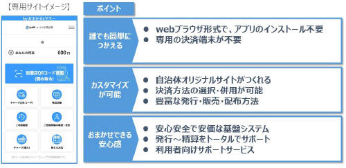 「おまかせeマネー」の使いやすい決済手段や加盟店の認証、決済、精算までのトータルサポートが利用者、加盟店に受け入れられたこと、また今年度から開始するカード型商品券の制作、多様な販売方法(オンライン/カード型)が高評価につながり継続しての採用となりました。
